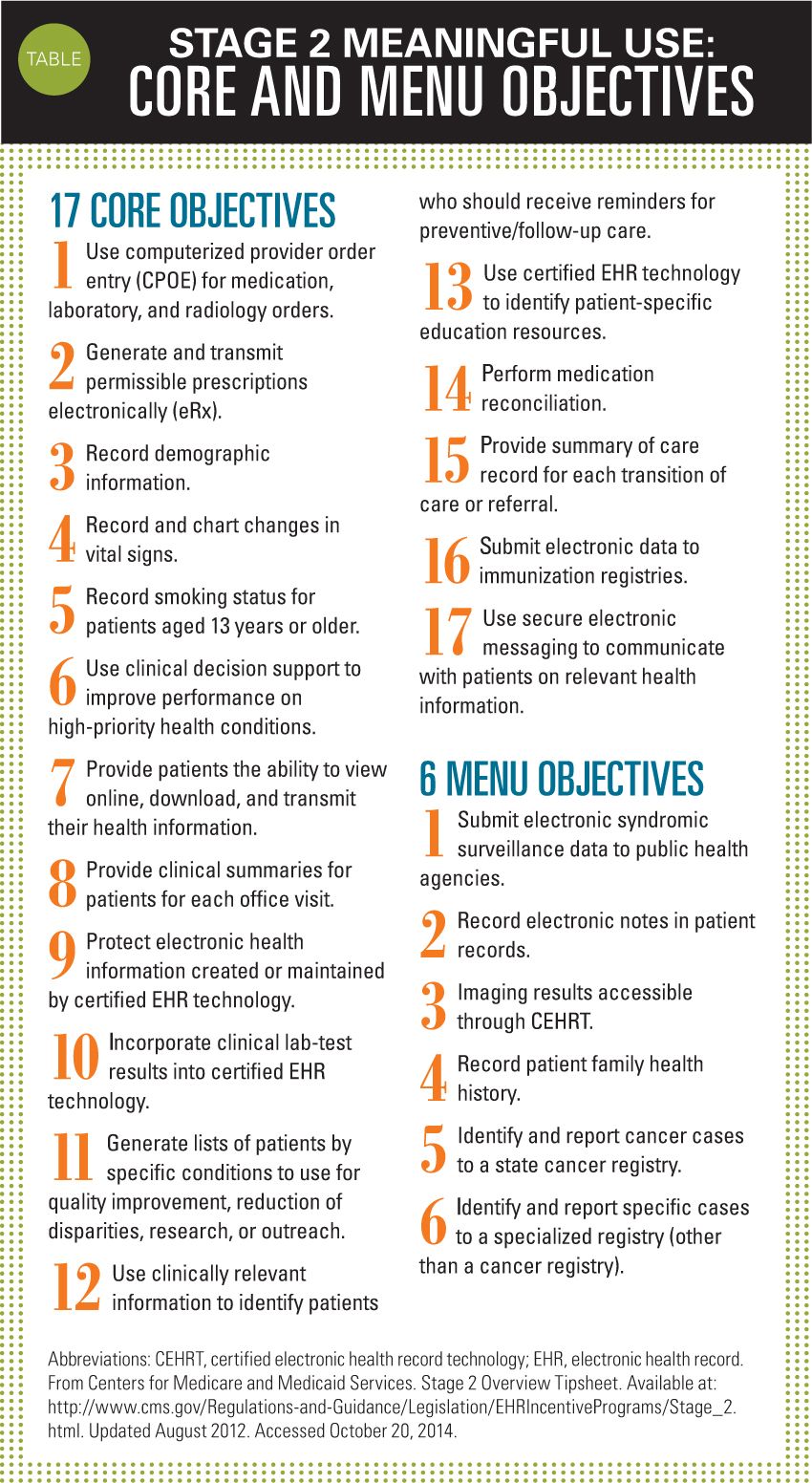 Centers for Medicare and Medicaid Services. Stage 2 Overview Tipsheet. Available at: http://www.cms.gov/Regulations-and-Guidance/Legislation/EHRIncentivePrograms/Stage_2.html. Updated August 2012. Accessed October 20, 2014.