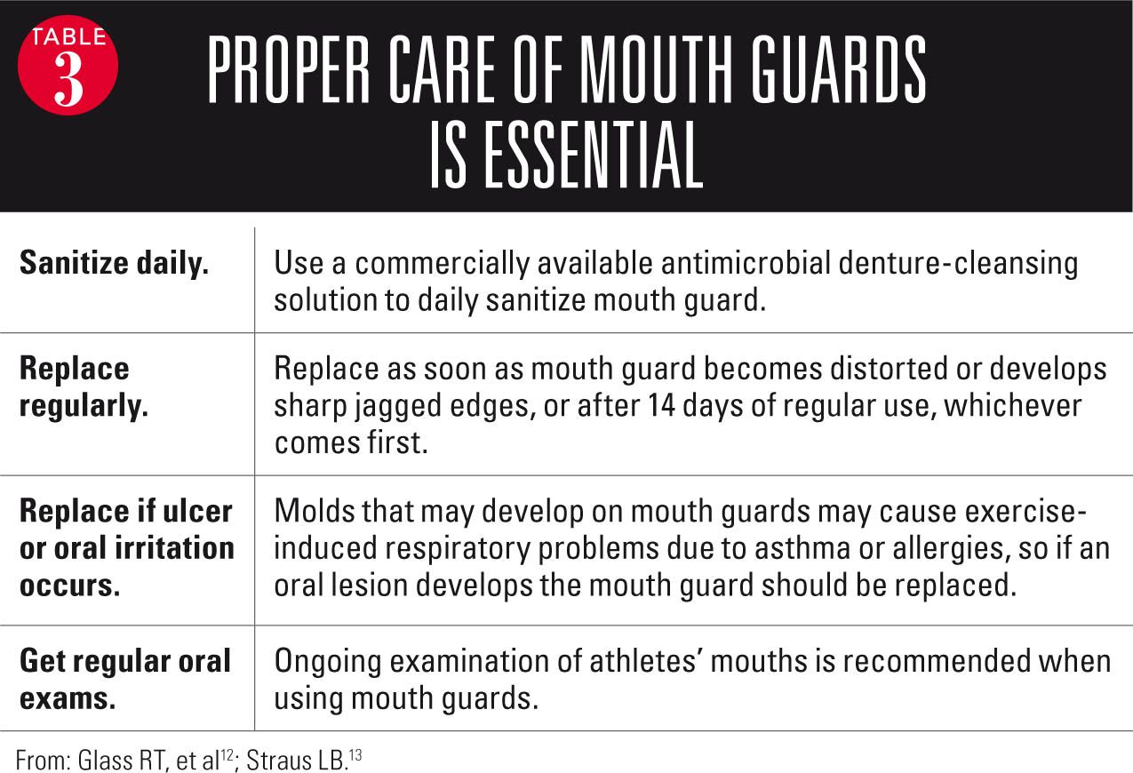 In addition to choosing and using a mouth guard, adequate care is essential to ensure proper hygiene and reduce the chance of infection based on data showing an increased chance of infection with the use of mouth guards that can collect bacteria, yeast, and fungi (Table 3).12,13