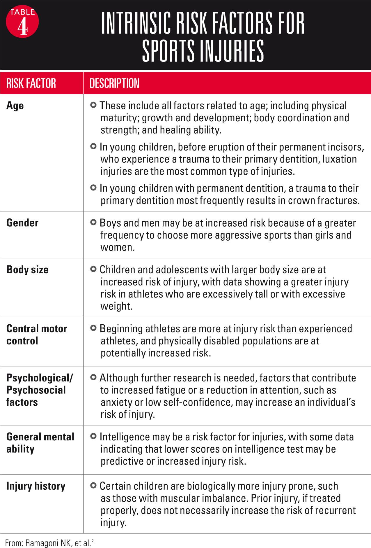 All these factors can help pediatricians assess a student athlete’s risk of sports injury, and can be useful when talking to the athlete and his or her parent about the importance of prevention and the use of mouth guards.