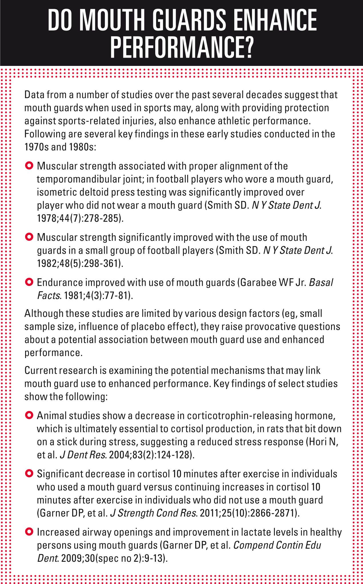 Along with protection, some data is emerging suggesting that mouth guards may enhance performance and ongoing research is looking at the mechanisms behind this potential relationship.7 (See “Do mouth guards enhance performance?”)