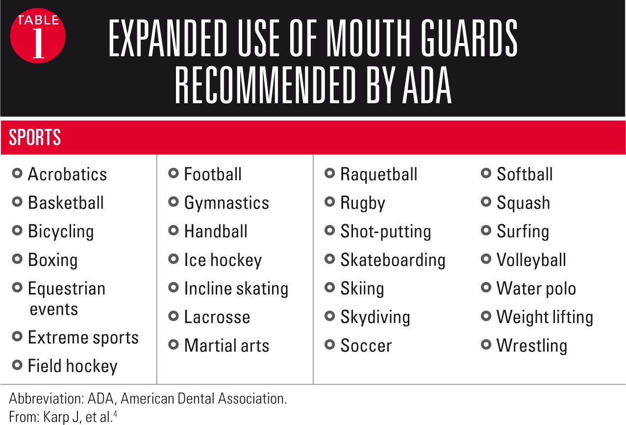 The American Dental Association (ADA) also recommends broadening the use of mouth guards to include a wide range of sports (Table 14).9