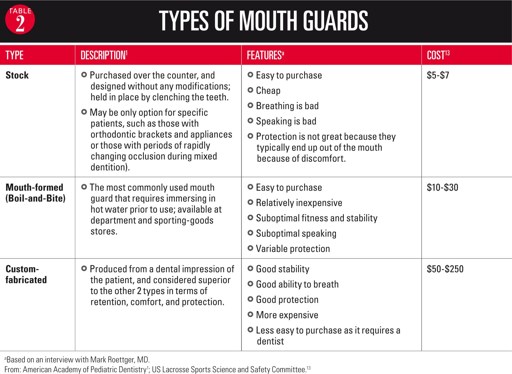 13. Straus LB. Mouth guards prevent dental injuries but require frequent replacement. MomsTEAM website. Available at: http://www.momsteam.com/health-safety/mouth-guards-prevent-dental-injuries-but-need-to-be-replaced-frequently. Updated August 22, 2013, Accessed July 22, 2015.