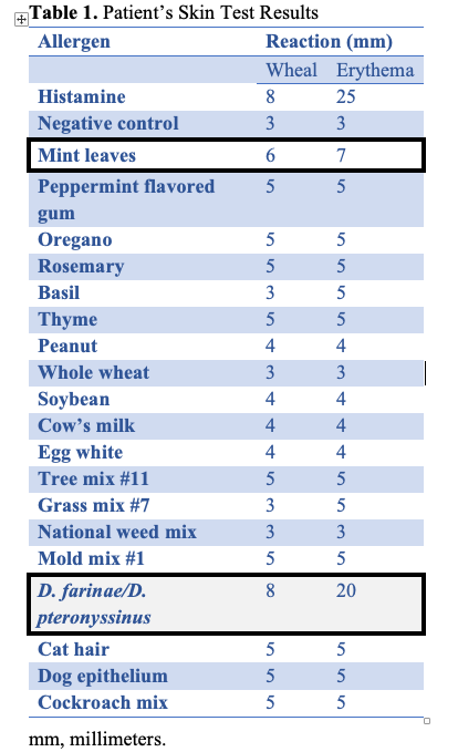The patient’s serum-specific immunoglobulin E (IgE) to mint, sage, basil, oregano, and thyme were less than 0.35 kU/L (Quest Diagnostics). Skin prick testing was performed for fresh mint leaves, peppermint gum (Wrigley’s 5 Cobalt peppermint flavor), fresh oregano, fresh rosemary, fresh basil, and fresh thyme. The patient was also tested with commercial extracts of the most common food and environmental allergens, including cow’s milk, egg whites, whole wheat, soybean, peanuts, tree mix No. 11, grass mix No. 7, national weed mix, mold mix No. 1, cat hair, dog epithelium, cockroach mix, Dermatophagoides pteronyssinus (D. pteronyssinus), and Dermatophagoides farinae (D. farinae) (Greer Laboratories). Five control subjects were skin tested to fresh mint leaf for comparison. A positive skin test was defined as a wheal at least 3 mm greater than the saline control. The patient had a positive skin test to fresh mint leaves and to standardized dust mite mix (Table 2). No control subjects reacted to fresh mint. The patient’s skin test to oregano, rosemary, basil, and thyme were negative.