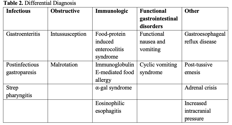 A 5-year-old boy with a history of asthma presented for a 1-year history of multiple episodes of emesis. The child’s first episode was at age 4, when he awoke and vomited 5 times. He also had an erythematous, pruritic rash on his arms and legs. Over the next 2 months, he had 2 additional episodes of vomiting with a rash occurring overnight. Two subsequent episodes of repetitive vomiting occurred in the evening without other symptoms. Another 2 episodes involved repetitive vomiting, a pruritic rash on the extremities, and diarrhea. A few episodes occurred within 30 to 45 minutes of brushing his teeth.