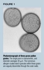 At any season, pollen release depends on the weather and is strongly favored by warm, dry, breezy conditions. Determinants of allergen exposure are complex, however, making generalizations risky. A substantial portion of pollen allergens, for example, are carried by aerosol particle fractions far smaller than intact grains. In the case of grass pollen, osmotic lysis can release allergen-bearing subcellular starch granules (see figure 1). Well-documented outbreaks of grass allergen-induced asthma and rhinitis during thunderstorms seem to reflect this effect.4 For other pollens, however, the factors favoring allergen carriage by small particles are unknown.