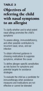 Increasing recognition of the potential impact of nasal allergy on children's health has led to greater emphasis on cost-effective management by primary care physicians. Pediatricians need to know how to identify allergic rhinitis and what treatments are effective as well as when subspecialty consultation is indicated.