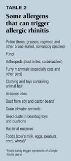 Although airborne agents are the primary allergens, especially in childhood, food allergy cannot be ignored as a cause of nasal symptoms. Cow's milk seems most problematic, causing symptoms that often begin shortly after birth. Less often, eggs, peanuts, corn, and wheat cause symptoms when reintroduced to the diet individually after a period of withdrawal. Maternal dietary components may, rarely, precipitate allergic symptoms in exclusively breastfed infants. Food allergy that produces only nasal symptoms is quite uncommon, however, and seldom continues beyond the preschool years. Table 2 lists allergens that contribute to allergic rhinitis.