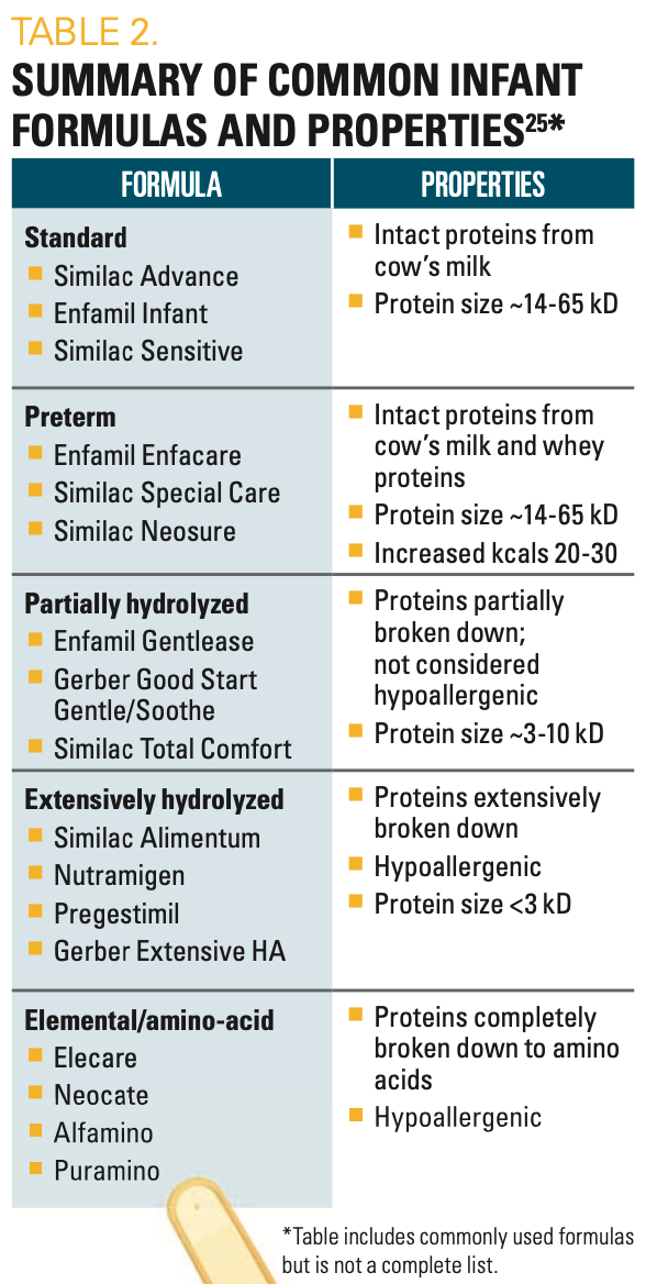 Despite breast milk’s many benefits, not all infants with intestinal injury will have access to it or will tolerate it. Formula selection should take into consideration the degree of intestinal injury and other comorbidities. A list of infant formulas and their properties is shown in Table 2. Among infants who had significant bowel injury requiring parenteral nutrition, those who were fed amino acid–based formula, also known as elemental formula, or breast milk required parenteral nutrition for a shorter duration, indicating that amino acid–based formula was also well tolerated by such infants.15 The amino acids and medium-chain triglycerides in these formulas are simpler to absorb.