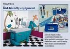 PediaPals is a company that specializes in products to help achieve a kid-friendly office atmosphere. For starters, PediaPals manufactures ZooPals, fiberglass examination tables that are shaped like large smiling animals (Figure 9). They have all the features of any fully equipped examination table, including a built-in paper roll holder and an elevated back, and come in a variety of colors. Full-size tables (dinosaur, elephant, lion, and polar bear) sell for $3,495. Compact tables without drawers (puppy, dolphin, and turtle), sell for $2,395. All tables can be purchased with a coordinated decal kit to decorate the walls of the examination room ($245).