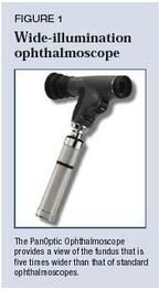 This year pediatricians can perform a more thorough eye examination by using the new Welch Allyn PanOptic Ophthalmoscope (Figure 1), which features what Welch Allyn calls Axial PointSource Optics. A series of lenses and mirrors converge halogen illumination to a point at the cornea and then enable the illumination pathway to diverge to the retina. The result is a very wide illuminated area of the fundus.
