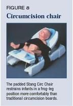 According to pediatrician Howard Stang, MD, there is a more humane way to position newborn infants for circumcision. Dr. Stang, who estimates that about a third of all hospital newborn circumcisions are performed by pediatricians, has redesigned the traditional circumcision restraint board to create a "circ chair" that positions the infant more comfortably in a frog-leg position while providing access to the operative site (Figure 8). The circ chair has comfortable foam pads and padded Velcro restraints that prevent movement during the procedure.