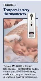 This year, Exergen has begun marketing a temporal artery thermometer for home use. The TAT- 2000C TemporalScanner is a sturdy thermometer that doesn't require a probe cover (Figure 3). The parent simply depresses the button on the instrument and lightly scans across the child's forehead, then releases the button to display the temperature. If there is perspiration on the forehead, which can decrease the recorded temperature through evaporation, the user also presses the scanner against the child's neck behind the ear before releasing the button. According to the manufacturer, most parents report that the device is much easier to use than an ear thermometer, and children find it easier to cooperate with TA measurements. The TAT-2000C can be purchased for about $60 at drugstores and Target stores and online at babiesrus. com. It comes with a training video on a CD-ROM.