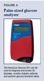 HemoCue has just released a pocket-sized glucose analyzer. The HemoCue Glucose 201 Analyzer (Figure 5) weighs less than a pound and, like the HemoCue Hemoglobin Analyzer, uses $1 disposable cuvettes to perform assays. The cuvette is filled by dipping the tip in a drop of fingerstick blood and placed in the analyzer. The result appears seconds later. The Glucose 201 Analyzer is not a glucose meter but rather an analytic lab device that can be used to diagnose and screen for diabetes as well as to monitor diabetic patients and perform glucose tolerance tests.