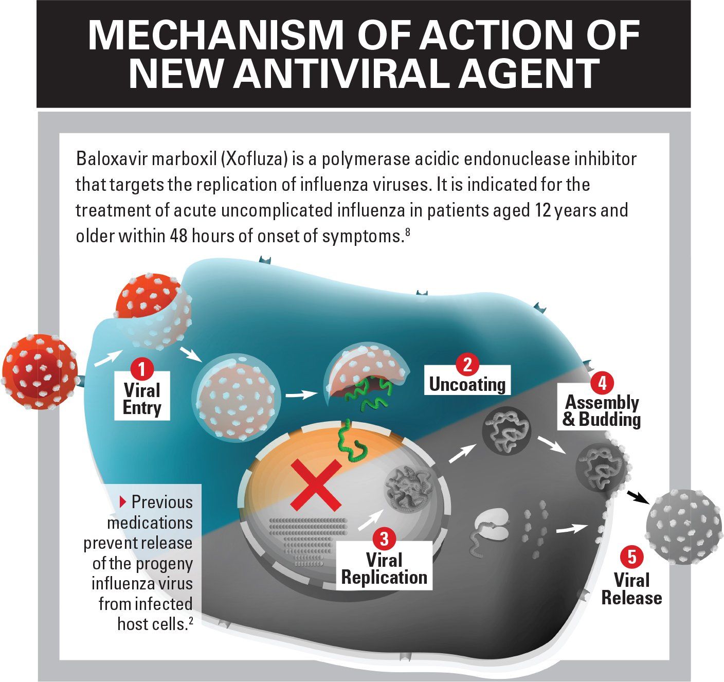 Traditional anti-influenza drugs have been comprised of 2 groups: neuraminidase inhibitors and M2 ion channel inhibitors (aka, adamantanes). Now the US Food and Drug Administration (FDA) has approved (October 24, 2018) the use of a new drug for influenza with a novel mechanism of action. Known as baloxavir marboxil (Xofluza; Genentech USA Inc., San Francisco, California), this new drug targets the cap-dependent endonuclease of influenza viruses and is being introduced because of concerns for resistance to current available drugs.1