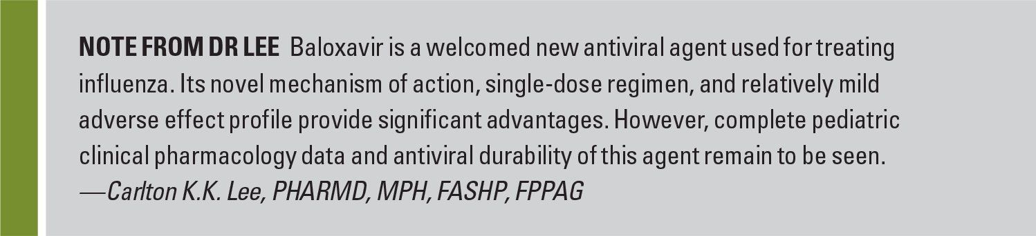 Currently, the FDA is recommending use of this medication in patients aged 12 years and older with symptoms for no more than 48 hours. The FDA recommends administration without dairy products, calcium-fortified beverages, polyvalent cation containing laxatives, or antacids. Baloxavir is currently available as 20-mg and 40-mg oral tablets as a single-dose regimen; 40 mg for those weighing 40 kg to less than 80 kg, and 80 mg for those weighing greater than 80 kg.8 One advantage of single dosing would be increased likelihood of patient adherence to medication regimen completion, especially in the outpatient setting. Similar to its predecessor oseltamivir, baloxavir is currently only recommended in uncomplicated infections as the trials so far have only tested the medication in this population. Further studies will be needed to understand better how to apply the use of baloxavir in the inpatient setting and with more complicated clinical presentations.3,8