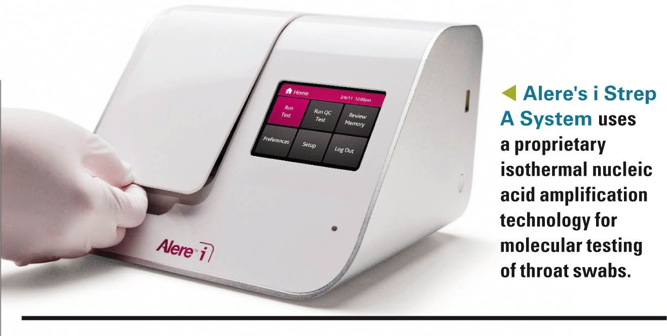 Alere (Waltham, Massachusetts) gained CLIA-waived status in April 2015 for its i Strep A test system. The i Strep A device detects GAS bacteria in throat swab specimens using Alere's proprietary isothermal nucleic acid amplification technology that produces results within 10 to 15 minutes. A color video displayed on the device’s screen walks users through the testing process. A sample receiver cartridge is placed in the machine and warmed for 3 minutes. The swab is placed in the cartridge for just 10 seconds, and then a pipette cartridge is used to transfer the sample onto a testing cartridge. The lid is closed and the testing cycle begins.