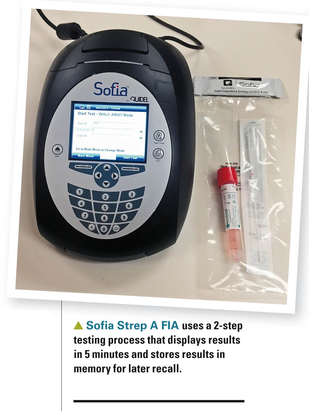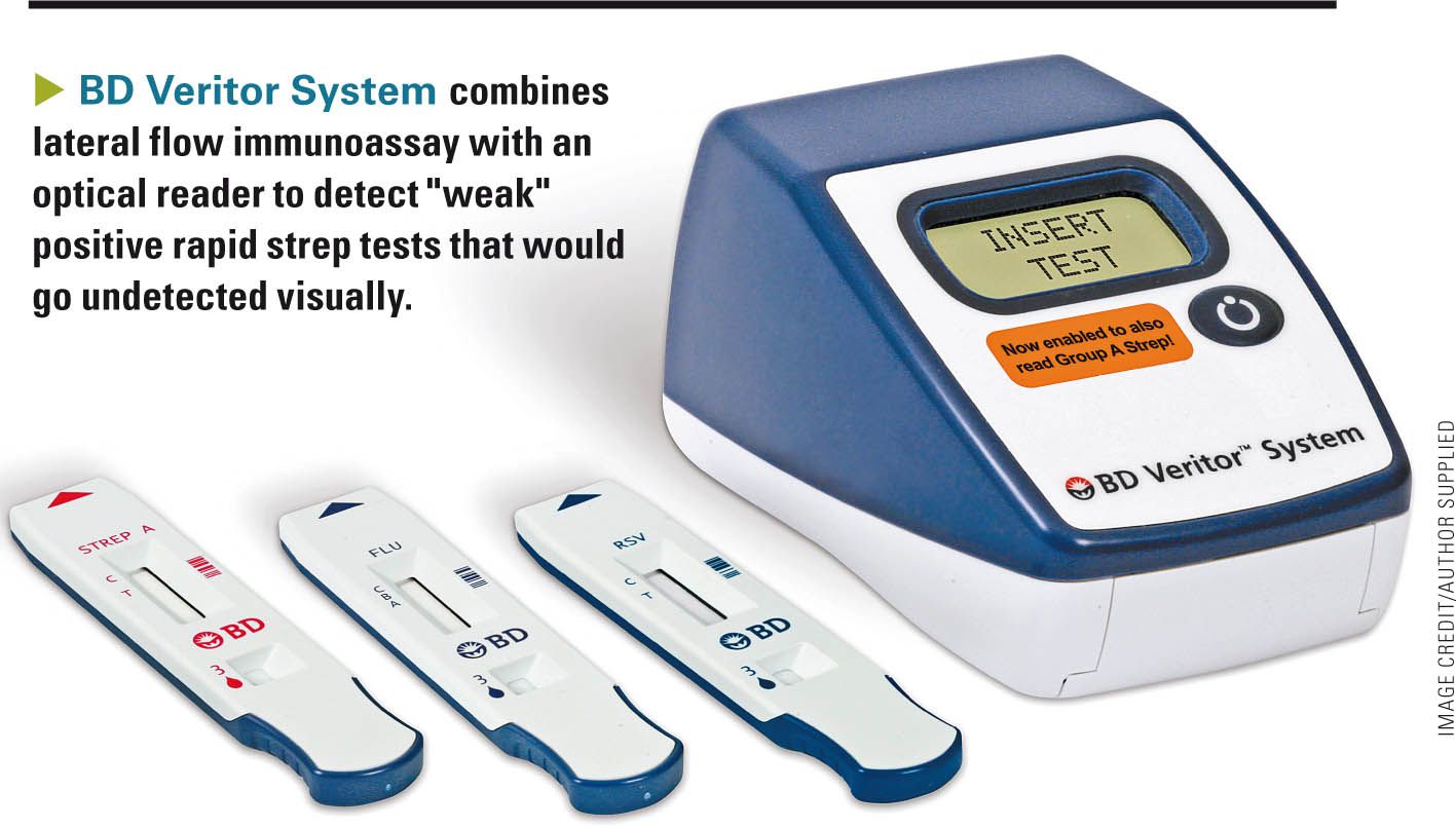The BD Veritor System from BD Diagnostics (Franklin Lakes, New Jersey), combines a lateral flow immunoassay with an optical reader to detect “weak” positive rapid strep tests that would otherwise go undetected visually. The reader costs $300, and the tests sell for $4 to $6 per test. Reimbursement by most insurance companies varies from $10 to $16 per test. The test uses a 2-reagent extraction step with which most pediatricians are familiar. Three drops of extracted specimen are placed in the sample well in the cartridge. After 5 minutes, the cartridge is inserted into the optical reader, which then displays the results. Most traditional lateral flow immunoassay tests have a “limit of detection” of 105 to 107 colony-forming units per mL (cfu/mL).8 The Veritor strep test has a threshold of 104 to 105 cfu/mL (package insert).