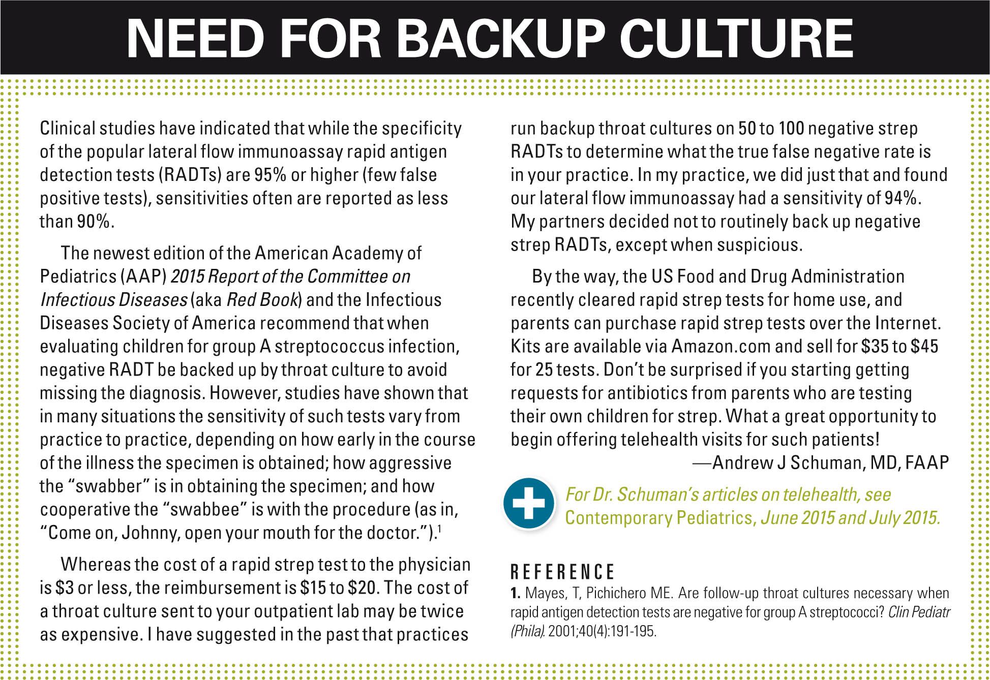 Before the availability of RADTs in the 1980s, pediatricians employed several methods of testing swabs for strep. Studies found that using a 2-swab sample is more reliable in detecting strep compared with a single swab. Additionally, placing the swab in Todd Hewitt broth for 2 hours before plating often increases the likelihood of generating a positive culture, especially when there are few bacteria on the throat swab.3