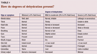 Determining the extent of fluid loss Dehydration can be categorized as mild, moderate, or severe, depending on the volume of fluid loss and the patient's clinical status. Classifications by the AAP, CDC, World Health Organization (WHO), and European Society of Pediatric Gastroenterology, Hepatology and Nutrition (ESPGHAN) have defined mild dehydration as a fluid deficit of less than 3% to 5%; moderate dehydration, 5% to 9% or 6% to 10%; and severe dehydration, greater than 9% or 10%.1 Numerous other parameters have been used to categorize dehydrated patients, including blood pressure, pulses, heart rate, skin turgor, mucous membrane dryness, and capillary refill time (Table 1). Recent studies reveal that signs of dehydration in a child may not be evident until there is a fluid deficit of 3% to 4%.4 Signs of severe dehydration are not obvious until a patient has a fluid loss of 9% to 10%.5