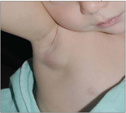 CSD is typically a self-limited regional lymphadenopathy. Fewer than 50% of affected patients have fever.3 The lymph nodes are almost always tender, often have overlying erythema, and occasionally suppurate. A red papule at the site of inoculation usually precedes the lymphadenopathy by 1 to 2 weeks. The lymphadenopathy involves the nodes that drain the inoculation site; axillary lymph nodes are most commonly affected.4 In a series of children who underwent axillary node biopsies, CSD was the second most common cause of axillary lymphadenopathy in children after reactive hyperplasia, accounting for 16% of cases.5