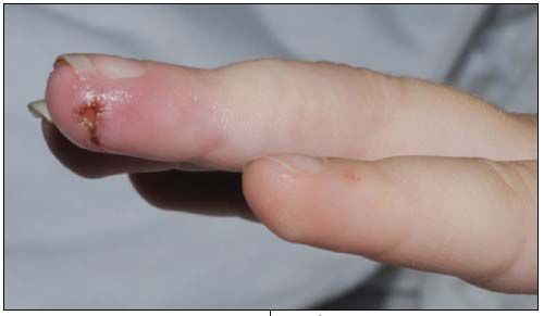 Figure 1 – The tender scab with purulent drainage and mild erythema on the palmar side of the distal right middle digit developed 6 weeks after a crush injury to the finger.