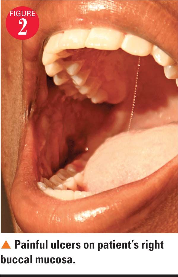 Erythema multiforme (EM) is considered to be a type IV hypersensitivity reaction to infectious etiologies and medications, as well as several other triggers.1 It is characterized by a symmetric eruption of red papules and/or urticarial plaques that enlarge centrifugally over 2 to 3 days forming the classic “target lesions.” Target lesions are characterized by at least 3 distinct zones, 2 of which show distinctive color change surrounding a central area of necrosis with crusting or blister formation. These lesions can expand up to 2 to 3 cm in diameter and generally resolve after 1 to 2 weeks.2 The most common locations are extensor surfaces of upper extremities and the face, but the palms, soles, and trunk also may be involved. Up to 50% of patients may have mucosal involvement of the buccal mucosa.3
