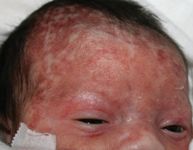 A newborn girl with skin eruption involving the face and scalp, and no adenopathy or organomegaly