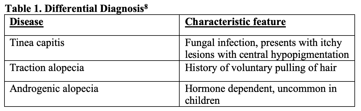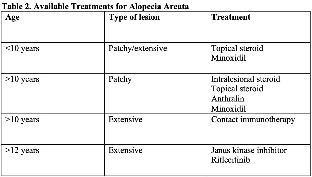 A patient-centric approach must be applied while treating children with AA. In children younger than 10 years, a wait-and-watch approach may be tried, as hair tends to regrow without any active intervention (Table 2). The first-line therapy includes application of high-potency topical steroids twice daily. Minoxidil is also an option that may be considered for hair growth in children younger than 10 years. In older children, treatment is based on the extent and number of lesions. For patchy hair loss, intralesional steroids may be tried in older adolescents; however, their use is less preferred due to pain. For extensive hair loss, contact immunotherapy with diphenylcyclopropenone (DPCP) and squaric acid dibutyl ester may be tried. This involves weekly appointments in the clinic for the treatment; however, the efficacy of DPCP for patchy AA has been reported as ranging from 88% to 100%. The Janus kinase inhibitor ritlecitinib is the only FDA-approved treatment among targeted therapies for the treatment of extensive AA in children older than 12 years.9-11