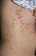On examination, the girl's body is marked by many tender red papules, some with central pustules. She is afebrile. No other family member has had a history of rash or recent febrile illness, and the family owns no pets. A possible clue: She celebrated her 11th birthday over the preceding weekend with a backyard pool party.