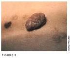 Physical examination reveals multiple flesh-colored, pinkish yellow, soft, irregularly shaped papules in a unilateral dermatomal distribution on the left buttock (Figure 1). The largest lesion is a 1.2 cm flesh-colored, pedunculated papule with a cerebriform surface (Figure 2). Three to five scattered 4 mm brown macules are found on the back of his neck and lower mid-back. No café-au-lait lesions appear on the rest of his body. An area of postinflammatory hyperpigmentation is present over the lumbar spine.