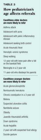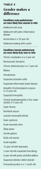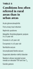 Doctors who have been in practice 11 to 20 years or more are more likely to refer certain conditions than doctors who have been in practice one to five years, and vice versa (Table 3). Even though male pediatricians make more referrals than female pediatricians (19 patients a month compared with 16), the list of conditions women are more likely to refer than men is far longer than the other way around (Table 4). Men and women were equally represented in the survey. Some conditions are less likely to be referred in rural areas than in urban areas (Table 5). Finally, pediatricians in the East refer some conditions more often than their colleagues in other parts of the country: hematemesis, idiopathic thrombocytopenic purpura in a 5-year-old, encopresis in a 6-year-old, nonfebrile seizure, attention deficit hyperactivity disorder, and a 12-year-old with knee pain after a fall on the baseball field.