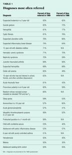 The questionnaire we sent to 2,000 pediatricians, nearly 30% of whom responded, was similar to one we used in a 1988 survey, except that the earlier survey did not ask about managed care. We queried the pediatrician about how often he or she referred a patient with any of 54 diagnoses to a subspecialist: never (0% of the time), rarely (1%10% of the time), occasionally (11%25%), sometimes (26%50%), usually (51%75%) or almost always (76%100%). The conditions pediatricians refer most frequently are suspected leukemia in a 3-year-old, suicide gesture, hemophilia, and cystic fibrosis. Table 1 lists the conditions referred more than half the time. Least likely to be referred are acute sinusitis, first urinary tract infection, an uncomplicated febrile seizure, iron deficiency anemia, or an asthma attack (Table 2). Most pediatricians (70%) said they refer the same number of patients as they did three years ago, while 18% thought their referrals had increased. The remaining 12% believe they make fewer referrals than they did three years ago.