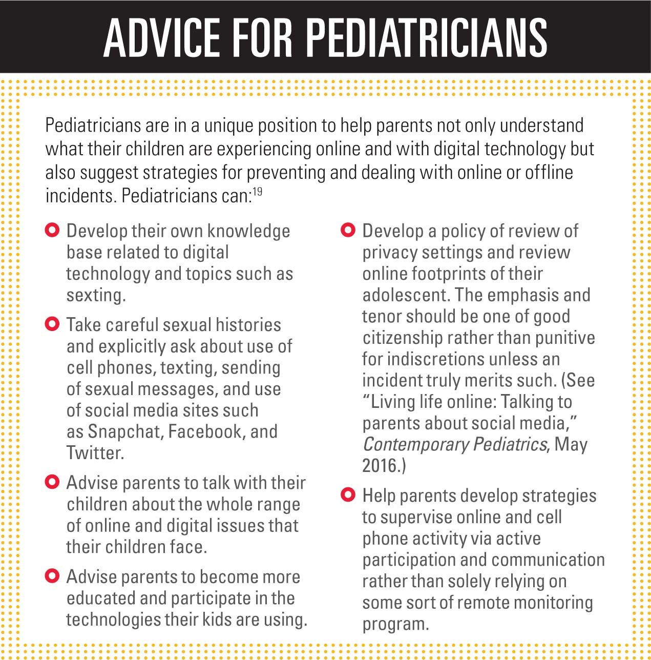 The pediatrician needs to develop awareness and skills that help identify and bridge the gap between adolescents and adults. Identifying adolescent experimentation versus dangerous behaviors can be difficult for the pediatrician. Failure to understand the dangerous implications of sexting and its place in adolescent sexual behavior can be detrimental for patients, families, and pediatricians.
