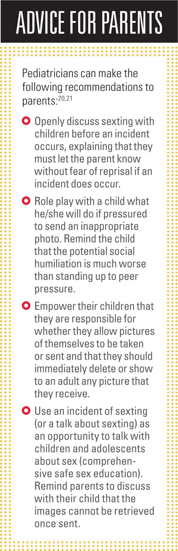 4. American Psychological Association. How common is sexting? Available at: http://www.apa.org/news/press/releases/2015/08/common-sexting.aspx. Published August 8, 2015. Accessed July 15, 2016.