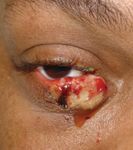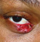 Skin examination revealed a single 2-cm x 1.5-cm fungating, exophytic tumor on the right lower eyelid margin. The lesion exhibited involvement of the palpebral conjunctiva but sparing of the bulbar conjunctiva. The surface was moist, with a yellow exudate and hemorrhagic crusting. On palpation the mass was firm but not friable. A shave biopsy of the lesion was sent for histopathology and culture, and valacyclovir (Valtrex) 500-mg orally three times daily was initiated because of concern that this lesion might represent a herpes simplex virus infection (HSV).