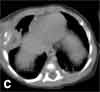A chest CT scan with contrast showed a chest wall mass of 1.3 3 1.8 3 2 cm displacing the lateral segment of the right middle lobe, contiguous with a bilobulated intra-extrathoracic mass with necrotic centers and thickened irregular walls of 2 cm (C).