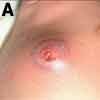 This lesion on the chest of a 6-week-old infant had developed over 2 days (A). It began as a small mass just below the right nipple. Initially, there was no tenderness or erythema; within 2 days, the lesion had begun to drain green-yellow and then white purulent exudate.