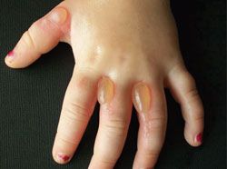 A 3-year-old girl was with her family on vacation in Cancun, Mexico, when blisters developed on the fingers of both her hands. The family returned home early and sought immediate medical attention.
