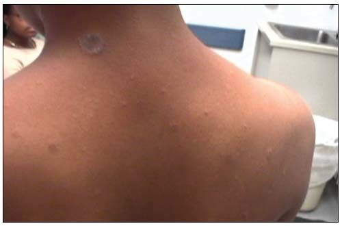 We followed the natural history of PR in 50 African American children in the United States.2 The data included the presence and location of a herald patch, duration of lesions, number of lesions, types and distribution of lesions, and presence of pruritus. The PR lesions involved the trunk in all patients, neck in 44%, face in 30%, arms and forearms in 60%, thighs and legs in 54%, pelvis or groin in 12%, and scalp in 8%. Almost all (90%) of our patients had pruritus. See Figures 1 to 7 for the clear-cut differences between our results and what pediatricians read in textbooks about PR. It is worth keeping in mind that the usual description of PR applies mainly to white patients.