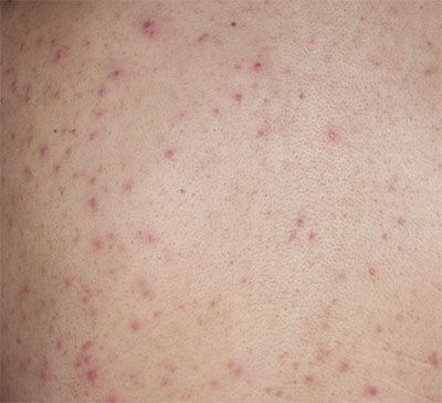 Classically described as an acneiform eruption, Malassezia folliculitis appears as 1- to 2-mm, erythematous, monomorphic, pruritic papules and pustules on the upper trunk, neck, and upper arms, and less frequently on the face.1,2 Predisposing factors are causes of immunosuppression, such as HIV infection, organ transplant, and chemotherapy; diabetes mellitus; and use of broad-spectrum antibiotics.1 The differential diagnosis includes bacterial folliculitis, Candida folliculitis (as a manifestation of disseminated candidal infection), acne vulgaris, eosinophilic folliculitis, and graft versus host disease in transplant recipients.1,3 Malassezia folliculitis should be considered in adolescents with acne that fails to respond to traditional therapies.2