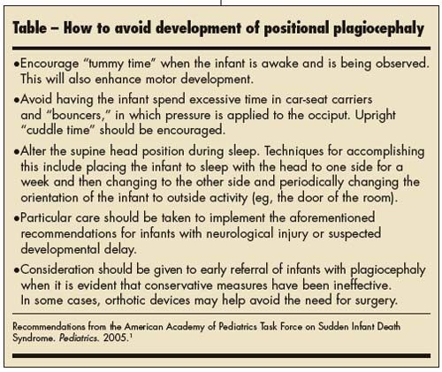 The Table lists the American Academy of Pediatrics' (AAP) recommendations for how to avoid the development of positional plagiocephaly.1 An important part of prevention and treatment is head repositioning. In addition to the head repositioning techniques listed in the Table, it may also help to face the infant's crib in a direction toward auditory and visual stimulation that entices the infant to lie on the unaffected side. Parents should also be encouraged to pay attention to how they hold the infant during feedings and avoid putting pressure on the flattened part of the skull. As per the AAP's recommendations, supine positioning during unattended sleep needs to be stressed to new parents to prevent the incidence of sudden infant death syndrome. However, parents should be reminded that a significant amount of prone positioning (“tummy time”) during times of supervised wakefulness is necessary to promote shoulder girdle strength and enhance motor development. One study noted that infants with positional plagiocephaly associated with supine positioning had less than 5 minutes per day of tummy time.2 It is equally important to stress the need for supine positioning during sleep and prone positioning during wakeful periods among secondary caregivers (child care providers, grandparents, foster parents, and babysitters).