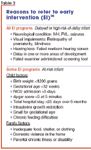 Primary care providers should also serve to integrate and coordinate other screening and referral needs of the child and family. For example, families of preemies under the age of 3 often need a prompt referral to an early intervention (EI) program. After the age of 3, a referral to a school's special education program is required (IDEA law). Admission into these programs is based on eligibility criteria. These criteria are unique from state-to-state and are summarized in Table 3. In some (but not all) states, a diagnosis of ELBW automatically qualifies an infant as eligible for services.