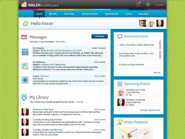 konciergeMD.com: Features customized Web portals for communicatng with patients.age-appropriate milestones, and helps parents organize their questions so they can make optimal use of their limited time with the pediatrician. From the pediatrician’s perspective, konciergeMD.com will work with practices to extract data from their EHRs to facilitate communication with patients. Lists of medications are maintained on the site, as are current immunization reports. The pricing model is very interesting because the company charges a reasonable per-physician yearly fee, or, alternatively, parents can “subscribe” to the practice portal for a $10-per-month fee that provides access to “premium features” designated by the practice, such as the ability to correspond with their physician or obtain forms electronically.