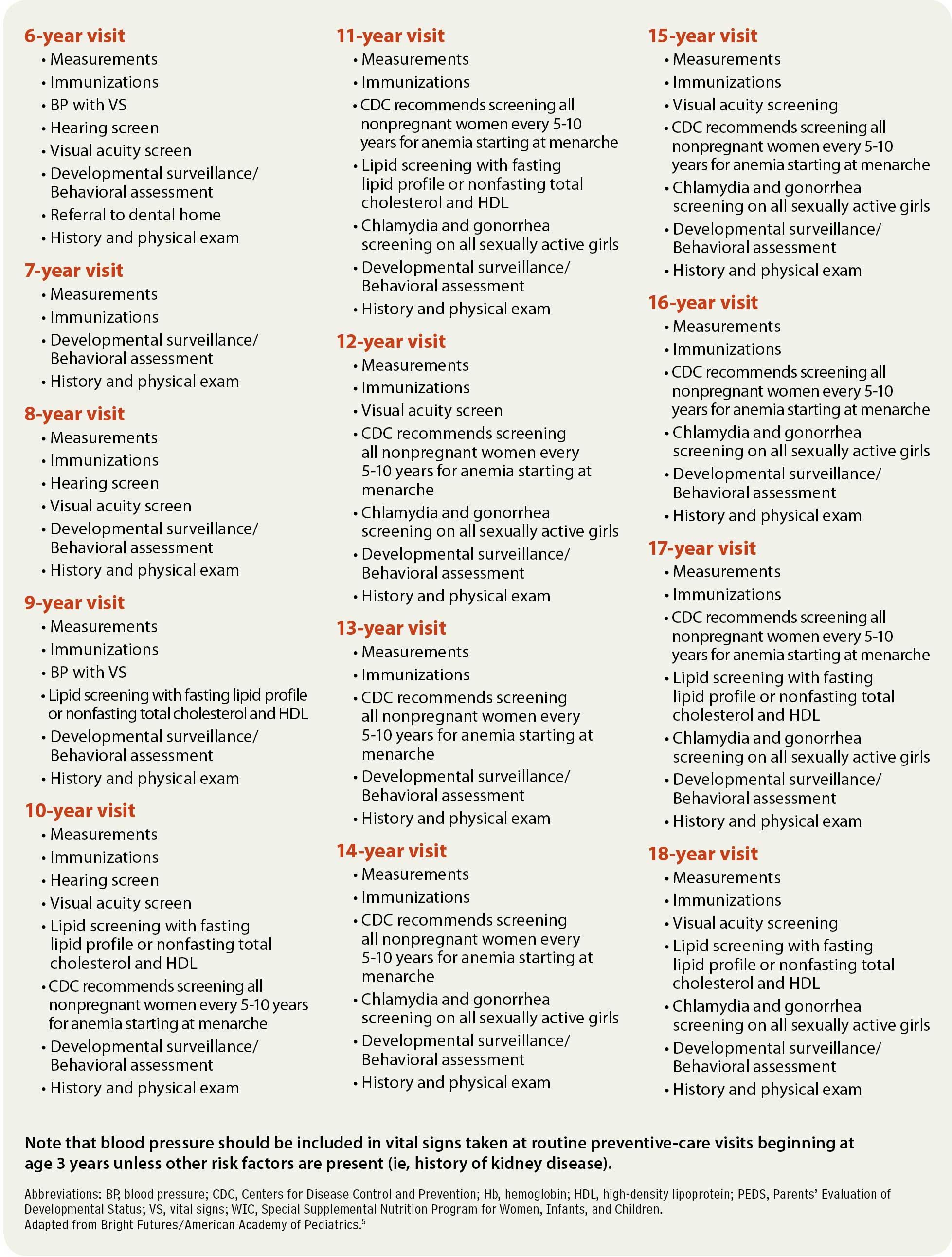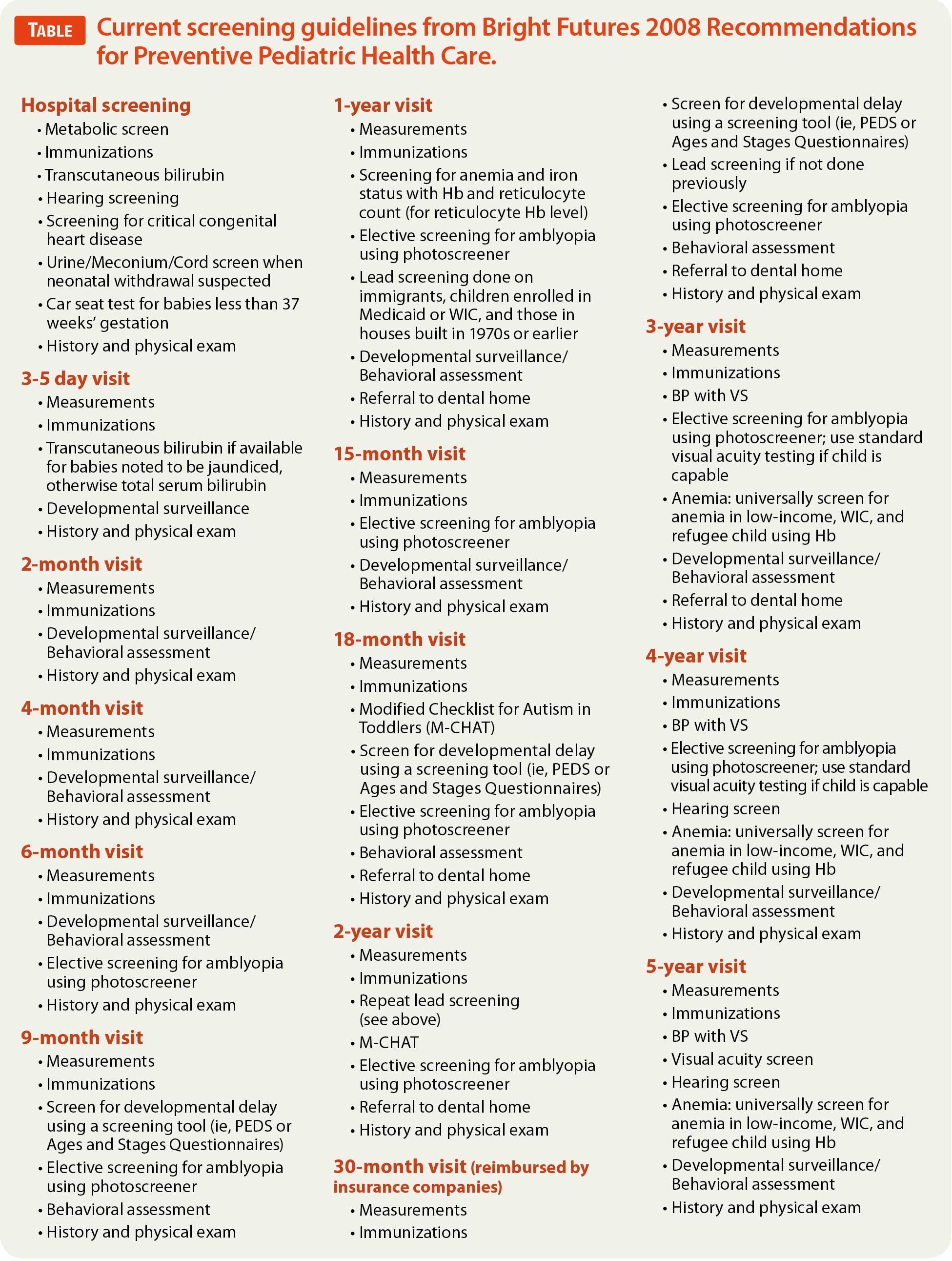 The Bright Futures initiative was launched in 1990 under the leadership of the Maternal and Child Health Bureau (MCHB) of the Health Resources and Services Administration (HRSA). In 2001, the MCHB awarded cooperative agreements to the AAP to lead the Bright Futures initiative. The linchpin of Bright Futures is the RPPHC, a wide-ranging set of guidelines that represent a single standard of care for pediatric providers. Bright Futures and the AAP continually update these recommendations, also called the periodicity schedule, which guide pediatricians and parents as to when well visits should be performed and which screening tests should be done at each visit. Because the periodicity schedule was last updated in 2008, there are new recommendations that have yet to be integrated into the periodicity schedule. For example, there are new recommendations regarding screening newborns for critical congenital heart disease (CCHD) before discharge from the hospital and screening young children for iron deficiency at 1 year of age.1,2 There are also modifications to previous recommendations for screening pediatric patients for hyperlipidemia as well as an endorsement of photoscreeners to electively screen for amblyopia in children.3,4 The Table lists screening guidelines that are current as of this writing.5