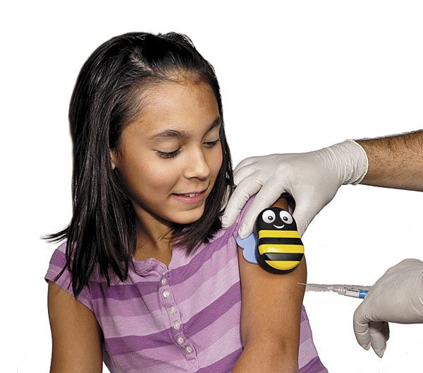 Perhaps the most stress-producing part of the visit for patient and parent is the administration of immunizations. Consider distraction techniques and devices that may blunt the pain associated with injections. These options include the Shot Blocker from Bionix Medical Technologies (Toledo, Ohio), a studded piece of plastic that presses against the skin at the injection site, blocking transmission of pain. The Buzzy Pain Relief System (MMJ Labs; Atlanta, Georgia) is a vibrating, kid-friendly gadget that is attached to a cold pack and placed on the arm above the injection site. By