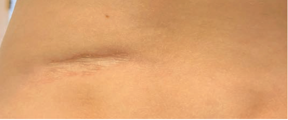 Persistent, atrophic fibrotic plaque that has been developing on patient's lower back for 3 months.