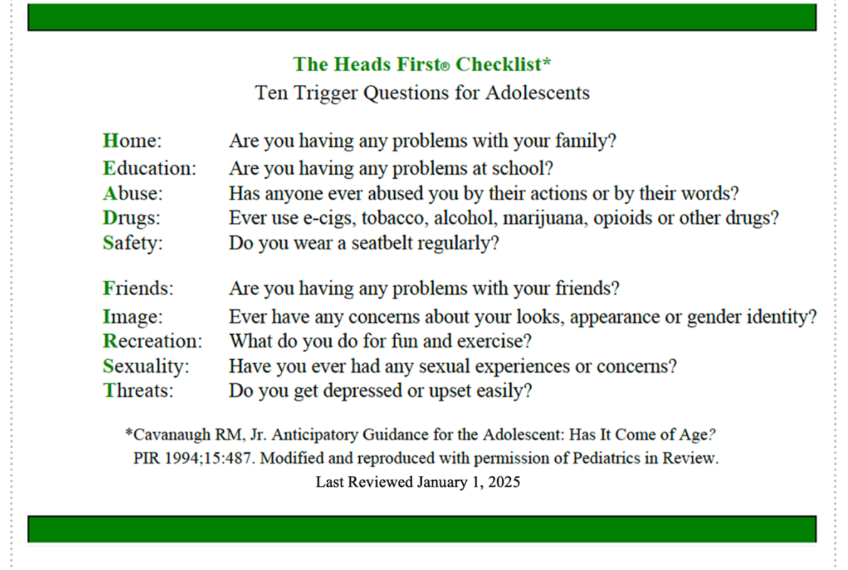 The psychosocial history should be considered an essential component of the annual checkup for adolescents. The HEADS FIRST Checklist acronym highlights the priority of including this history as part of routine adolescent health care. It also underscores the value of utilizing a proactive, rather than reactive, approach to identify teens at risk for serious illness, injury, and/or death. The checklist gives the busy pediatric practitioner an up-to-date yet organized and concise framework to address major causes of morbidity and mortality among youth. Early recognition can be crucial to obtaining timely intervention and an optimal outcome. The checklist can and should be implemented within a strengths-based paradigm with encouragement for those who are making healthy choices. It is a unique privilege to have an opportunity to make a difference in the lives of not only present but also future generations. Our commitment to comprehensive adolescent health services is essential, and the time to act is now. We must be prepared to meet the moment.
