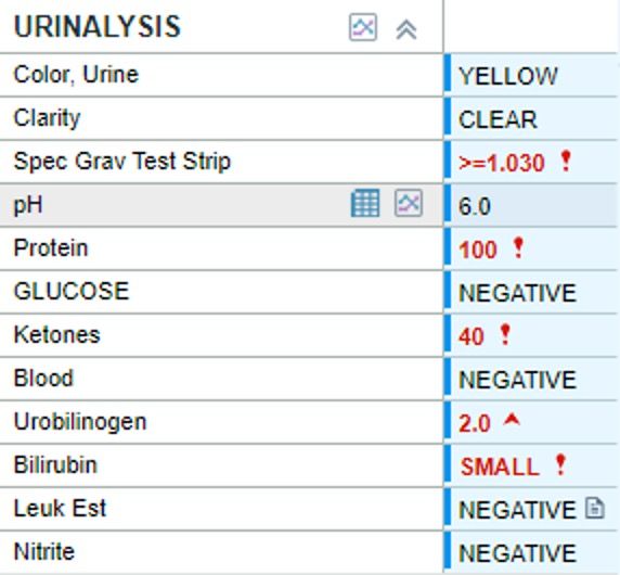 Urinalysis was obtained, which demonstrated increased specific gravity, protein, ketones urobilinogen, and small bilirubin with negative nitrites and leukocyte esterase (Figure 1). A urine B-HCG was also performed and was negative.