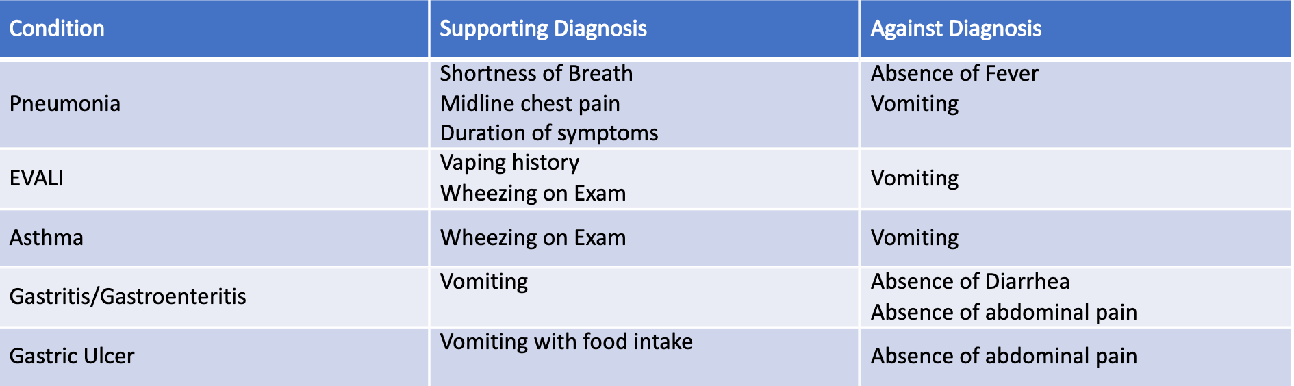 This patient’s presentation of vomiting with only mild shortness of breath had a wide differential. Her subjective presentation of vomiting immediately after food intake with only mild shortness of breath was a highly unique presentation of pneumonia. Her objective presentation was similarly abnormal, with exam findings of tachycardia with decreased SPO2 of 95% without fever and with diffuse wheezing without crackles. The gastrointestinal aspect of her presentation led us to expect a gastritis or gastroenteritis, but the overlying pulmonary symptoms led us towards EVALI or asthma, with a combination of the two as the presumed diagnosis.