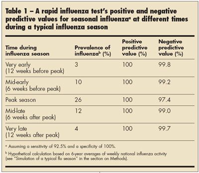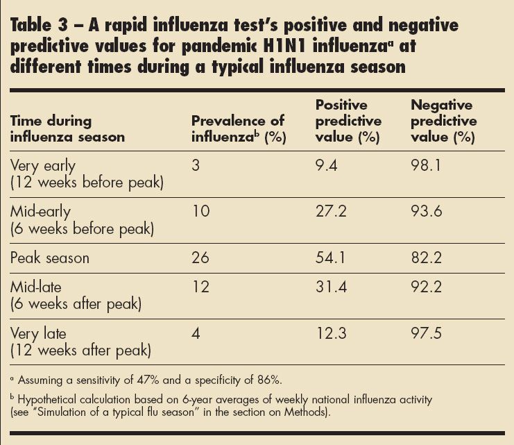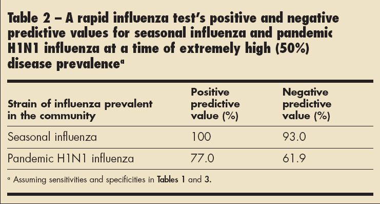Discussion. This analysis illuminates 2 important points. First, the predictive values of RIDTs-for both seasonal flu and pandemic H1N1 influenza- will vary over the course of the flu season depending on the level of disease activity in the community. The positive predictive value of an RIDT for either strain of flu can be very low at off-peak times, such as very early in the season, because the test is not perfectly specific and the disease frequency is low. Likewise, the negative predictive value can be low during a surge of clinical influenza cases because the test is not perfectly sensitive and the disease frequency is very high.